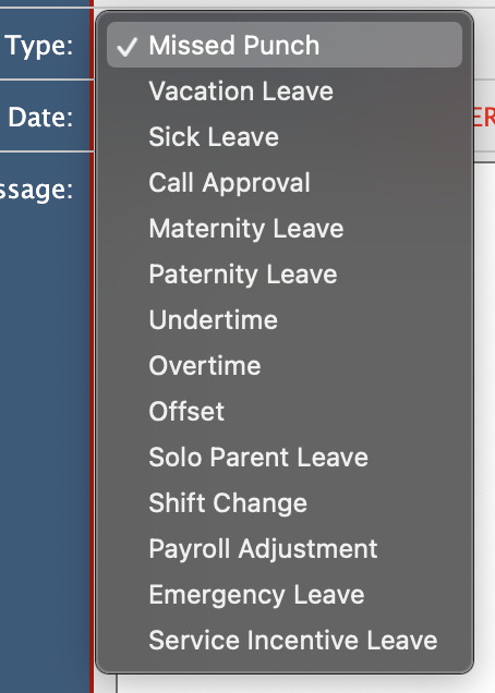 payroll/classes/modules/hierarchy/AuthorizationFactory.class.phppayroll/classes/modules/core/AuthorizationFactory.class.phpAre almost identical so it is advisable to double check this files if both switches codes have been modified else the request will show in the drop down but will fail to be filed.